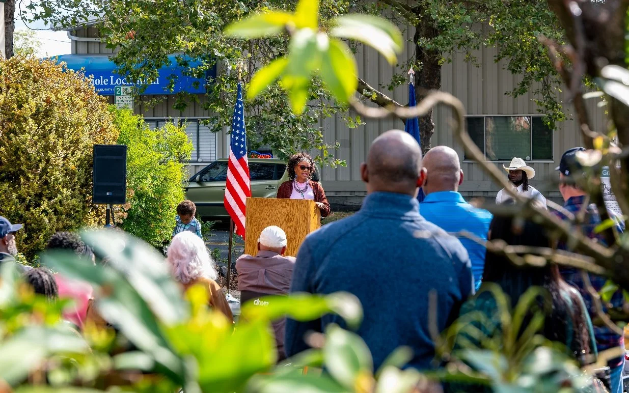 The unveiling of the Historic Mims Houses Memorial Monument providing a history of the first Black families in Eugene and the role the Mims Houses played in that history.